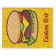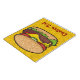 Cheeseburger icon. Junk food outline icons yellow pattern background. Custom text.