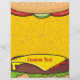 Cheeseburger cartoon illustration. Junk food outline icons yellow pattern background. Custom text.