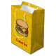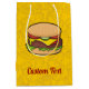 Cheeseburger cartoon illustration. Yellow seamless junk food pattern background. Custom text on both sides.