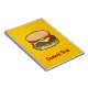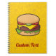 Cheeseburger cartoon illustration. Junk food outline icons yellow pattern background. Custom text.