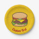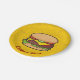 Cheeseburger cartoon illustration. Junk food outline icons yellow pattern background. Custom text.