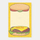 Cheeseburger cartoon illustration. Junk food outline icons yellow pattern background. Custom text.