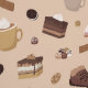 Dessert wallpaper for your kitchen, a café, coffee shop, bakery or similar with a seamless pattern of cheesecake slices, coffee, cookies and more delicious desserts in a neutral color palette.