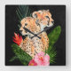 Cheetah Bouquet II by Annie Warren. Two cheetahs are framed by tropical leaves and greenery against a black background. | 164453Z