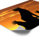 A mother cheetah and her three cubs settle down for the night as the sun sets behind them. Their silhouettes stand sharply against the blazing colors of the sunset. Computer art by Kathie Miller.