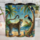 This vibrant, artistic image features a cheetah with an extra-long, striped tail standing on a sunny beach. The cheetah is surrounded by lush palm trees and tropical plants, with two toucans perched on a tree. The background includes the ocean with crashing waves and a blue sky with flying birds, creating a playful, tropical scene.