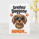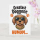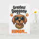 This card features a stylized dog portrait centered on a stark white background, making the warm brown fur and floppy ears stand out right away. The dog wears dark reflective sunglasses with a spotted pattern on the frames, giving it a confident look that still feels affectionate, like it’s posing for someone it adores ❤️. A thick gold-link chain rests around its neck, adding a fun, dressy touch that reads like a friendly wink. Near the top, the phrase “Greatest Doggone” appears in bold black lettering, positioned above the dog’s head. Two small orange paw prints sit to the left and right of that top line, like tiny decorations cheering the message on 🌼. Beneath the portrait, “HUMOM...” is placed in orange, balancing the layout and drawing the eye downward. The palette stays focused on brown, black, orange, and gold, with the orange paw prints and bottom word standing out against the white space.