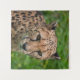 A close-up image of a cheetah staring directly at the camera. The cheetah's face fills the frame, highlighting its intense gaze and distinctive facial features. The background is a lush shade of green, providing a vibrant contrast to the cheetah's spotted fur.