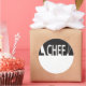 Chef name tag for cookoff or fun food event has the word CHEF and silhouettes of a knife and whisk in white on a black background. Write the contestant or chef name in the blank white area at the bottom on these matte finish stickers. Clean geometric design is good for any event from professional to just-for-fun or kids cooking event.