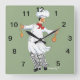 An original painting of a chef by Anne Ormsby adorns this fun wall clock.