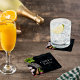Paper coasters decorated with a herb chopper, herbs and onions. Black rustic canvas print as background Text: Chef's Table