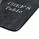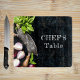 Decorated with a herb chopper, herbs and onions. Black rustic canvas print as background Text: Chef's Table
