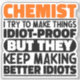 Funny Chemist Sayings "Chemist I Try To Make Things Idiot Proof But They Keep Making Better Idiots". Grab this Funny Chemist design as a funny gifts for an awesome mom, dad or friend.