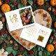 The front of the card showcases a heart-shaped floral wreath in rich autumn tones such as oranges, reds, and golds. The wreath forms the "o" in the word "love," creating a romantic and distinctive design. At the center of the wreath is a photo of the couple, adding a personalized and special touch. This design combines autumn blooms with the couple’s photo to create a visually appealing and emotional card.