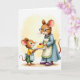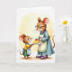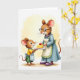 Designed with two friendly, human-like rodent characters sharing a close kitchen-style moment, the illustration centers on a smaller figure offering a slice of cake to a taller, older companion ❤️. The younger character wears a sunny yellow tunic and a striped apron tied in a neat bow, looking up with wide eyes and a grin that feels like a thank-you in motion. In their hands is a white plate holding a creamy dessert slice topped with one glossy red cherry, drawing attention like a tiny gift. The older character faces them with a gentle, approving look, wearing round glasses, a light blue dress, a trimmed apron, and a strand of purple beads that adds a cozy touch. Their body language leans toward each other, suggesting trust and affection through the way their gazes meet. A short Mother’s Day message sits near the top in a soft, medium-dark tone, with a smaller line of text placed below in a lighter shade, leaving plenty of open space 🌼. The background is a pale yellow wash that softly frames the pair, while the fur textures, whiskers, and clothing seams are carefully detailed, and the cherry shines bright red against the white plate.