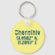 Keychain design features latitude and longitude coordinates for Chernihiv, Ukraine in distressed dark blue font on yellow background. Chernihiv is located in Northern Ukraine and has been nicknamed "The City of Legends".