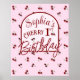 A charming cherry design to celebrate your little one's first birthday. This cherry poster provides a hint of whimsy and vintage charm. This unique artwork has various tones of scarlet, blush, violet, and chartreuse. Change the background color, graphic and text to fully personalize and customize.