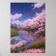 A peaceful river flows gently, its banks adorned with a vivid pink canvas of blooming flowers. Cherry blossom trees sway in the breeze, while the lush green grass completes the idyllic scenery. This digital artwork captures the essence of serenity and natural beauty, bringing a sense of calm and tranquility to your living space.