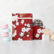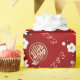 This wrapping paper features a black and white cherry blossom branch, gold double happiness symbols and bride and groom initials on a shimmering red background.