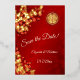 Red cherry blossoms and a real gold foil double happiness symbol on a shimmering red background. Save the date text in an elegant script. Matching Chinese wedding products available.