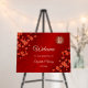 This traditional Chinese wedding Welcome board features pretty red cherry blossoms and a golden double happiness symbol on a shimmering ruby red background.
