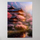 This digital artwork depicts a stunning traditional Japanese mansion nestled among a beautiful display of pink cherry blossom trees. The scene is basked in the warm glow of the evening light, creating a serene and peaceful atmosphere. The intricate details of the mansion's architecture and the delicate petals of the cherry blossom trees are highlighted in this beautiful piece of art.