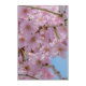 The image showcases a close-up, slightly angled view of a cherry blossom tree branch against a bright, clear blue sky. The scene is dominated by clusters of soft pink cherry blossoms. Each blossom appears delicate and full, with multiple layers of petals that are slightly translucent, allowing light to filter through them. The center of each flower reveals a delicate pattern of stamens in shades of yellow and orange.