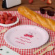 "Cherry first birthday" themed birthday paper plates with illustrated cherries tied with a pink preppy bow, and adorable handwritten fonts.