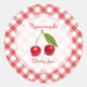 Customizable retro stickers for homemade cherry jam, jelly or preserves jars with fresh cherries on red and white gingham tablecloth pattern.