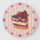 Whimsical, retro inspired design features cherry layer cake slice on striped background with pink heart clock face wreath