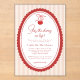Cherry on Top Coquette Bow Pink Baby Shower Invitation - An adorable design featuring a hand drawn cherry hanging from a coquette bow with hand written and modern typography. The background is trendy pink and white stripes, the perfect way to celebrate your little one. Our easy to use template makes it so easy for your personalize your invitation. Cherry on top Coquette Bow Pink Baby Shower will be part of a Baby Shower Collection.
