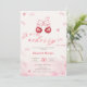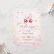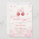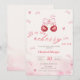 Featuring a delightful cherry theme, elegant red script, hearts, and soft watercolor pink bows, this invite is perfect for a cutesy cherry celebration.