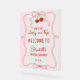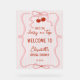 This design features a charming coquette aesthetic, blending classy vintage-inspired pink preppy stripes with delicate hand-drawn bows and a ribbon frame, and vibrant red cherries. The playful yet elegant layout is perfect for a summer fruit-themed shower, or a classic garden party.