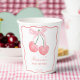 Cherry pink bow coquette whimsical baby girl baby shower monogrammed paper cups template , cute cherries with a bow ribbon border baby shower personalized paper cups, cherry baby shower customized paper cups summer fruit baby shower personalized table decor printed paper cups