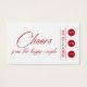 Want to offer your guests a way to enjoy several alcoholic beverages during your reception or party without being committed to an open bar? These 3 punch drink tickets could be ideal for you! In a beautiful, slim, slanted script font, the cherry red typography graphic overlay reads "Cheers from the happy couple". Rotated, to the right and placed between slim red lines are the words "Redeem at the Bar"; this text is editable. Three numbered circles were added to the right so your guests can have their cards punched at the bar as they're served up to three complementary drinks. The other side has template fields set up for your names and date. // 78 // Designed by Melody Watson for Paper Muserie.