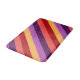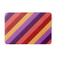A medium sized bath mat featuring a colorful pattern motif of diagonal stripes in cherry red, melon pink, violet, plum purple, and banana yellow.