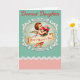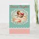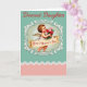 Designed with a classical, cherub-like winged infant at the center, this card shows a baby with rosy cheeks and golden curls floating inside an ornate off-white frame. The infant wears a simple patterned outfit and holds a bouquet of roses in deep red and soft blush pink, as if offering them with gentle affection ❤️. The background is split into a pastel teal upper area and a blush pink lower area, creating a soft, romantic setting. Between the two sections, a scalloped strip of intricate white lace runs horizontally like a delicate divider. Near the top, a dedication line appears in ruby-red lettering, centered above the framed scene. Across the infant’s middle, an aged-looking banner stretches left to right with a short message in dark ink, adding a sweet, old-fashioned touch 🌼. Fine details like the lace edging, the curled frame accents, and the layered rose petals stand out against the calm teal field.