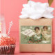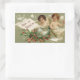 Two adorable cherubs are sitting on a stack of large white papers; one surrounded by pink and red roses and the other cherub is holding a single rose. Message: From Thy Valentine is written on a stack of papers with white doves flying in the background. Image of a Vintage Valentine's Day Postcard.