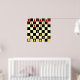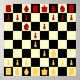 A colorful print of a chessboard set up to show some opening moves. The board is cream and black, with traditional style chess pieces in red and ivory.