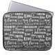 Cool soft gray laptop sleeve printed with a typographic pattern of words associated with playing chess. Including Knight, King, Queen, Pawn, Checkmate, Bishop and Rook. Ideal for the chess player in your life.