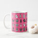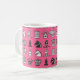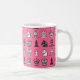 Mug featuring chess design with dark and light chess pieces in rows on a pink background.