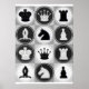 Black and White Chess Pieces Pattern Poster Print. A stylish chess pattern with king, queen, rook, knight, bishop and pawn chess icons on a chessboard square pattern poster print. This cool, nerdy chess poster gift is fully customizable, add your text and images.