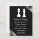 Black and white wedding Save The Date announcement done in a chess game theme. The silhouettes of a white Queen and King chess piece decorate the top of the black announcement, with the upper right and lower left corners done in a black and white checkerboard. Text in white is ready to personalize with your wedding information. Great announcement for the chess loving couple.