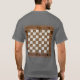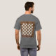 In the hushed intensity of a chess match, amidst the anticipation and strategic tension, the chess player leans forward with a quiet confidence. With a subtle smirk playing upon their lips, they gaze intently at the board, their eyes alight with the sparks of calculation and foresight. Bonus, chess board on back of shirt.