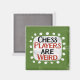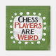 "Chess Players Are Weird" is a cute text design in green with black and red text, along with a white accent shape and white textured whimsical dots surrounding it.