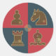 Round sticker featuring chess design with the knight, pawn, rook and bishop on blue and red background.
