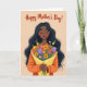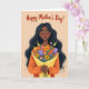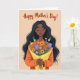 This card features a graceful woman shown from the upper torso at the center, with long dark hair flowing around her calm face and softly closed eyes that suggest a tender, affectionate moment ❤️. Her cheeks carry a gentle blush and her lips rest in a relaxed line, as if she’s savoring a sweet thought about someone close. She cradles a full bouquet with sunny yellow blooms, rich purple flowers, and soft pink blossoms, creating a romantic, caring gesture in her pose. The flowers are wrapped in bright yellow paper that pops against her warm orange top, tying the colors together in a friendly, loving way. The background is a smooth peach tone that keeps the focus on her and the bouquet, like a quiet scene meant for a heartfelt exchange. Near the top, the message “Happy Mother’s Day!” is placed above the figure in dark lettering that stands out clearly against the peach backdrop 🌼. Gentle shading and simple linework define her hair, face, and hands without adding clutter. The bouquet sits centered at her chest, with the yellow wrap folded into neat angles around the stems.