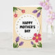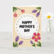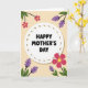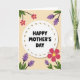 This greeting card features a soft white oval in the center, edged with a muted earthy dotted border that feels like a gentle frame around a note. Inside the oval, a short Mother’s Day message sits neatly in rounded black lettering, centered and easy to read, like a warm word shared between close family ❤️. The background is a creamy pale peach-yellow that keeps everything light and welcoming. From the corners, stylized flowers and leaves lean inward as if gathering around the message, creating a friendly, affectionate closeness. Bright fuchsia-pink blossoms with small sunny yellow centers mingle with clusters of lavender-purple florets, suggesting a calm, caring mood 🌼. Dark green leaves and slim black stems add contrast and guide the eye back toward the middle. The floral shapes are simple and flat in color, with the stems curling gently along the edges of the card. The pink blooms and purple sprigs sit at the top-left and bottom-right corners, with dark green leaves spreading outward against the pale background.