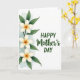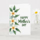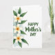 This greeting card features a calm white background with a vertical cluster of three five-petaled flowers along the left edge, set beside slim deep-green leaves that lean in as if in a gentle embrace ❤️. Each bloom has creamy white petals circling a glowing center that shifts from warm orange to soft golden yellow, giving the flowers a tender, close-to-the-heart look. A pale aqua watercolor wash forms a soft halo around the florals, like a quiet morning mist settling behind them. On the right side, the message is arranged in three lines in dark forest green, balanced with plenty of open space. “HAPPY” sits at the top in a simple sans-serif style, “Mother’s” appears larger in a flowing cursive-like lettering, and “DAY” returns to the same straightforward style as the first line 🌼. The spacing feels airy, letting the flowers and words face each other like a warm exchange across the page. Light watercolor texture is visible in the petals and the aqua wash, with the three blooms aligned vertically on the left and the dark green text stacked neatly on the right.