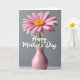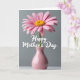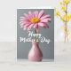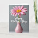 This card features a single pink flower with many slim petals spreading outward from a golden-yellow center, like a gentle burst of affection ❤️. The bloom stands tall in a slender, glossy vase colored a muted rose, resting on a softly lit, pale surface. Behind it, a smooth cool-gray background keeps the focus on the flower, giving the scene a calm, intimate tone. Soft, diffused light smooths out shadows and makes the petals look tender and slightly curled, as if leaning in for a quiet moment. Across the mid-area of the design, the words “Happy Mother’s Day” appear in white lettering, floating clearly against the gray. The text sits just above the vase, balanced so the flower still feels like the main focus, with a gentle, caring mood 🌼. Near the bottom, the vase and lower edge fade slightly out of focus, adding depth while the pink petals remain crisp and detailed.
